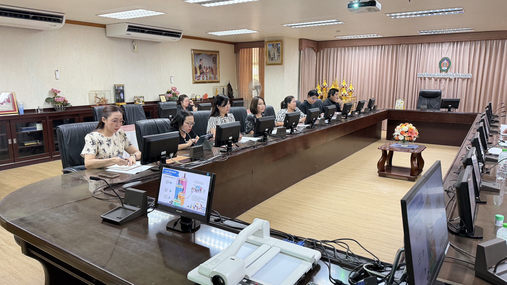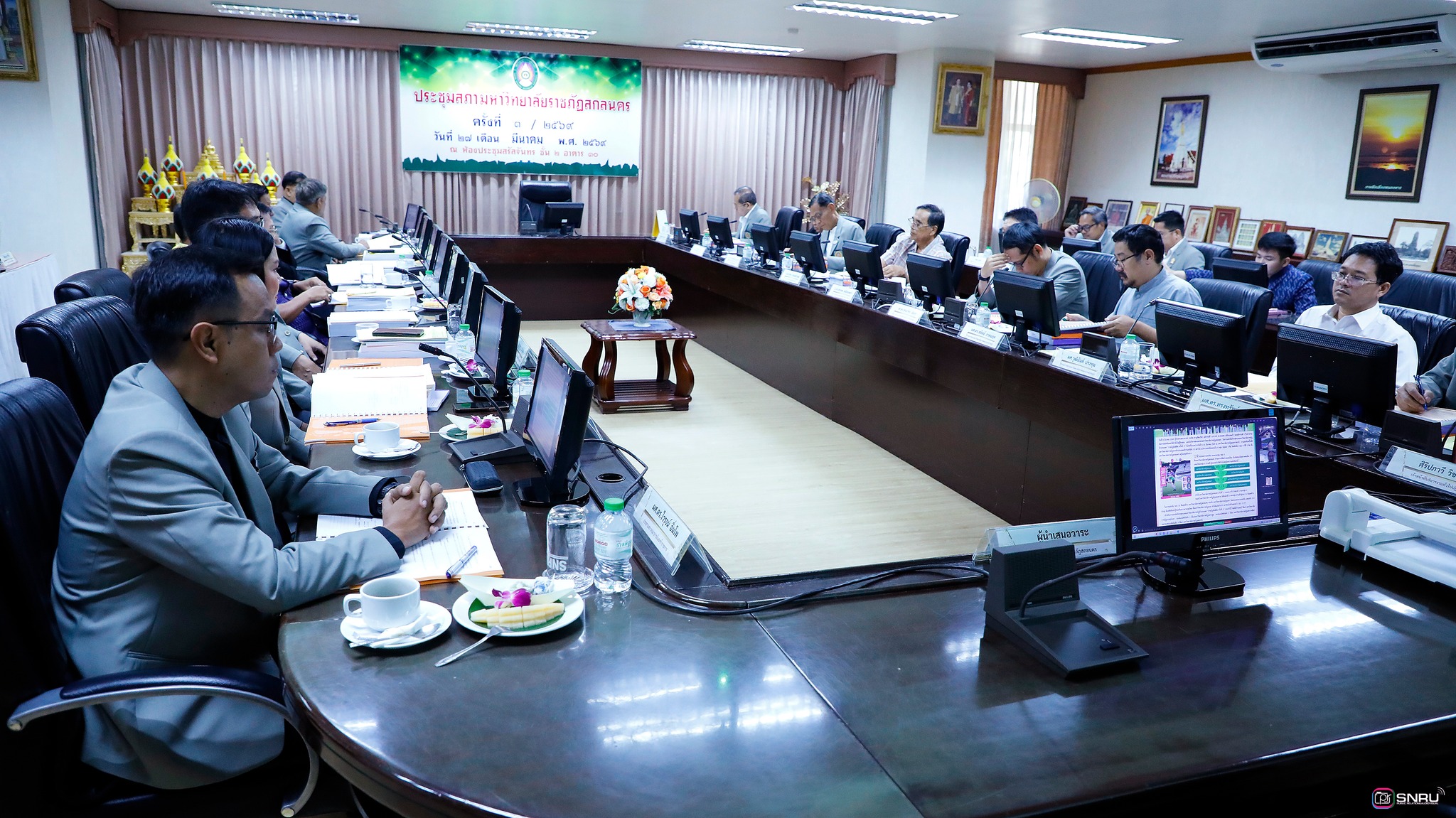 วันที่ 27 มีนาคม 2569 นางสาวณัฐพิมล วัชรกุล หัวหน้างานบริหารทั่วไป กองกลาง สำนักงานอธิการบดี และนางศิริปภาวี วิชาชาติ เจ้าหน้าที่บริหารงานทั่วไป เข้าร่วมปฏิบัติหน้าที่ผู้ช่วยเลขานุการ ในการประชุมสภามหาวิทยาลัยฯ ครั้งที่ 3/2569 โดยมี รศ.ดร.สมเจตน์ ภูศรี นายกสภามหาวิทยาลัยฯ เป็นประธานในการประชุม พร้อมด้วยคณะกรรมการผู้ทรงคุณวุฒิ และคณะกรรมการสภามหาวิทยาลัย เข้าร่วมประชุมเพื่อพิจารณาในวาระสำคัญต่างๆ ณ ห้องประชุมสร้อยสุวรรณา อาคาร 10 มหาวิทยาลัยราชภัฏสกลนคร