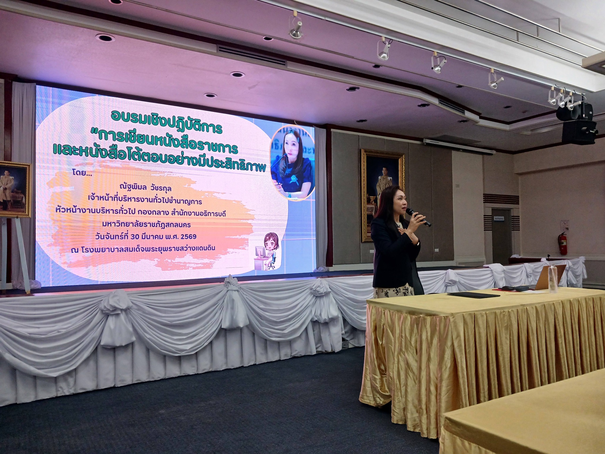 นางสาวณัฐพิมล วัชรกุล หัวหน้างานบริหารทั่วไป กองกลาง สำนักงานอธิการบดี ได้รับเชิญให้เป็นวิทยากรในการอบรมเชิงปฏิบัติการ เรื่อง งานสารบรรณและการเขียนหนังสือราชการ นศ.หลักสูตรวิทยาศาสตร์บัฑิต สาขาวิชาคณิตศาสตร์ ปี 3 ในวันพุธที่ 25 มีนาคม 2569 เวลา 13.00 – 16.30 น. ณ ห้องคอมพิวเตอร์ ชั้น 1 อาคาร 7 คณะวิทยาศาสตร์และเทคโนโลยี มหาวิทยาลัยราชภัฏสกลนคร เพื่อให้ความรู้ในการจัดทำหนังสือราชการที่ถูกต้องตามระเบียบงานสารบรรณ