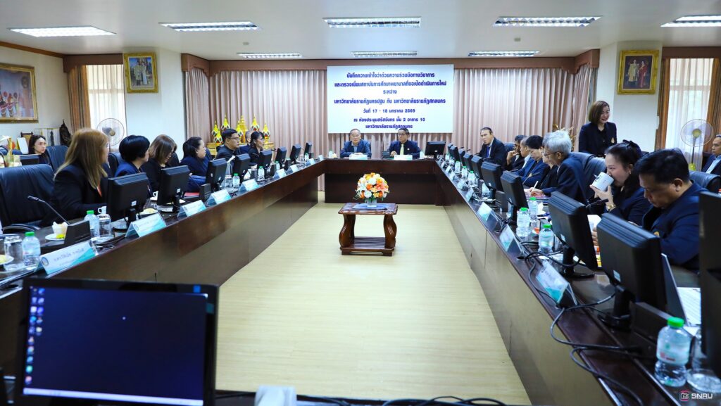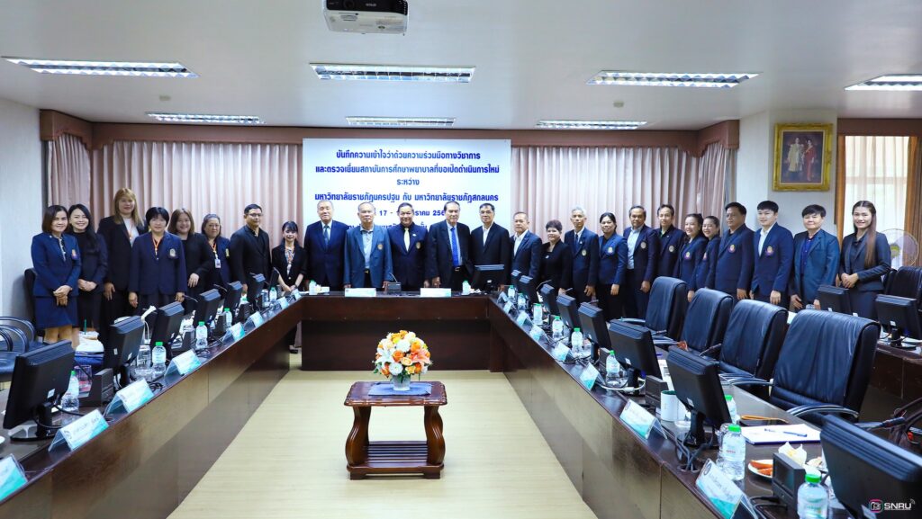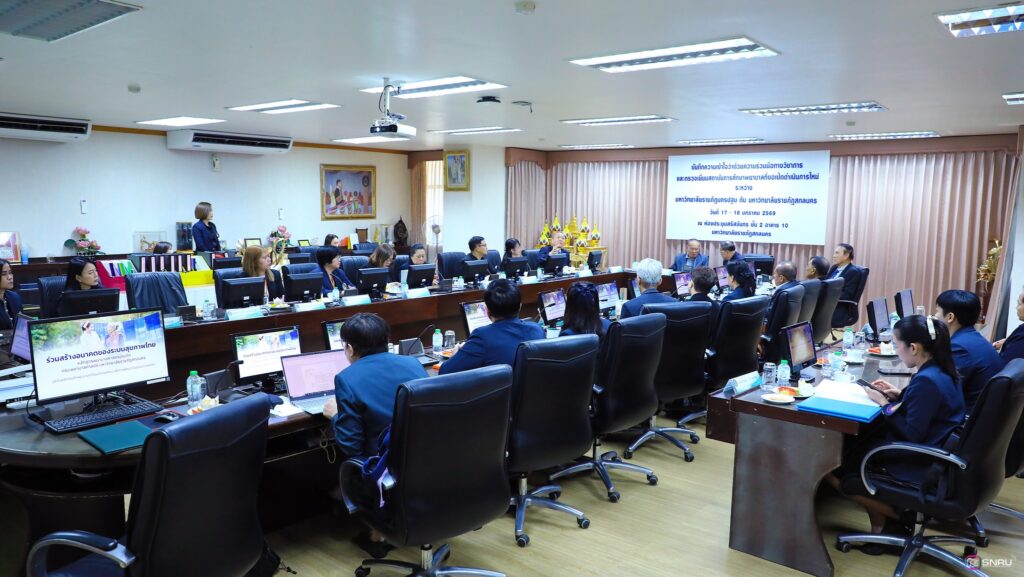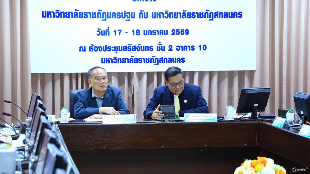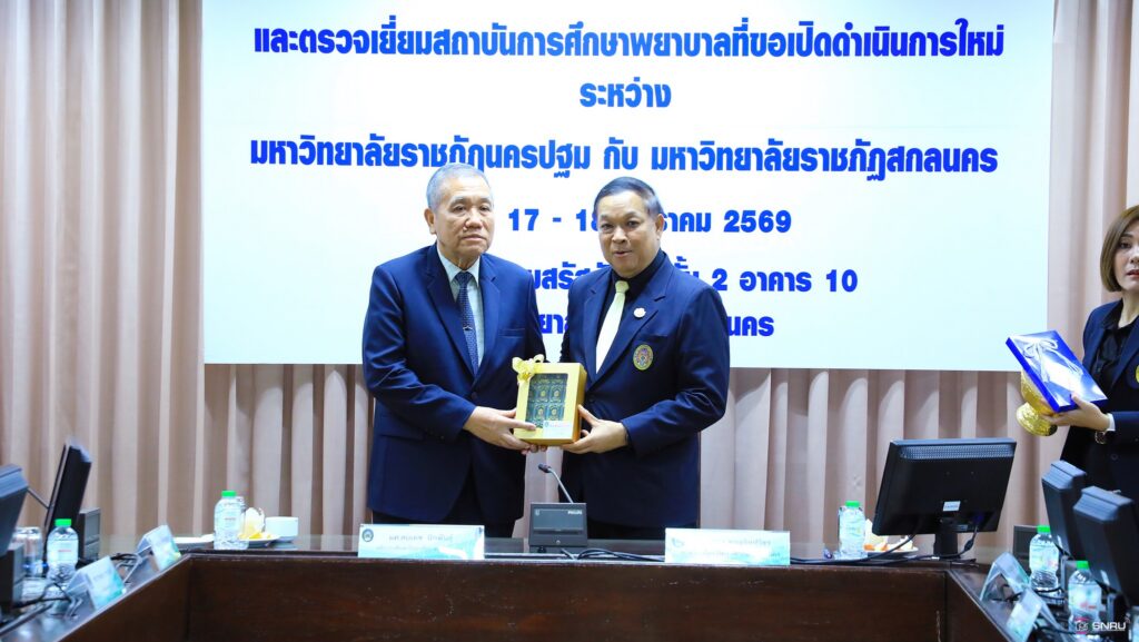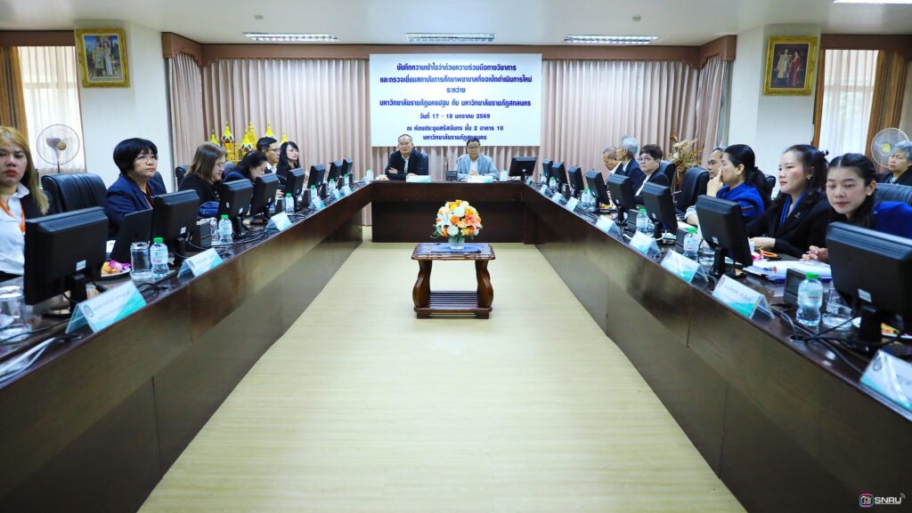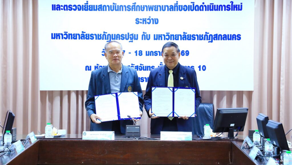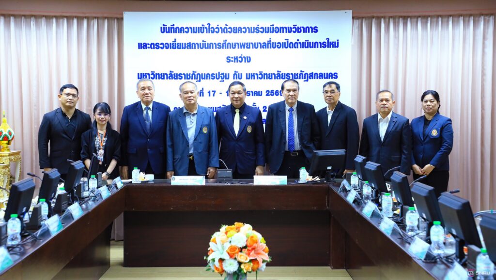 วันที่ 17-18 มกราคม 2569 นางสาวณัฐพิมล วัชรกุล หัวหน้างานบริหารทั่วไป และบุคลากร เข้าร่วมปฏิบัติหน้าที่ฝ่ายต้อนรับในการลงนามบันทึกความเข้าใจว่าด้วยความร่วมมือทางวิชาการ ระหว่างมหาวิทยาลัยราชภัฏสกลนคร ร่วมกับมหาวิทยาลัยราชภัฏนครปฐม โดยคณะพยาบาลศาสตร์เป็นสถาบันการศึกษาพี่เลี้ยงให้แก่ คณะพยาบาลศาสตร์ มหาวิทยาลัยราชภัฏสกลนคร โดยมี ผศ.ชาคริต ชาญชิตปรีชา อธิการบดีมหาวิทยาลัยราชภัฏสกลนคร ลงนามร่วมกับ ผศ.สมเดช นิลพันธ์ อธิการบดีมหาวิทยาลัยราชภัฏนครปฐม ณ ห้องประชุมสรัสจันทร ชั้น 2 อาคาร 10